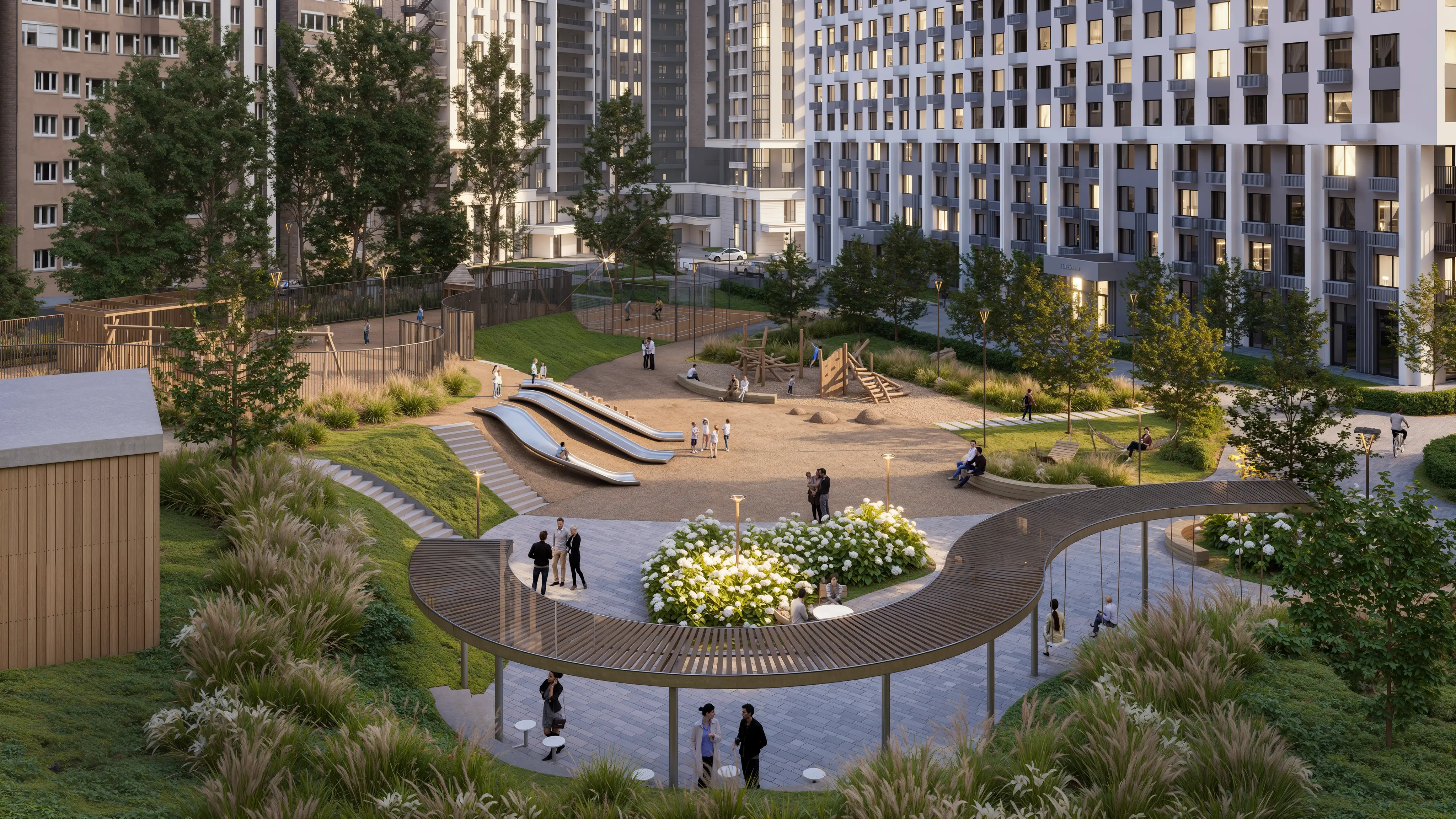 Мы создаем общественное пространство вокруг комплекса с точками притяжения и активностями, что бы весь досуг семьи мог проходить рядом с домом.